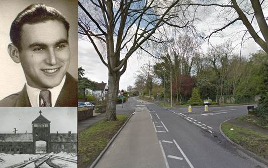 A young Rudolf Vrba. The gate at Auschwitz with the motto arbeit mact frei (work makes you free) over the gate with the railway tracks, which were not bombed soon enough, and a road in Carshalton, Surrey, England