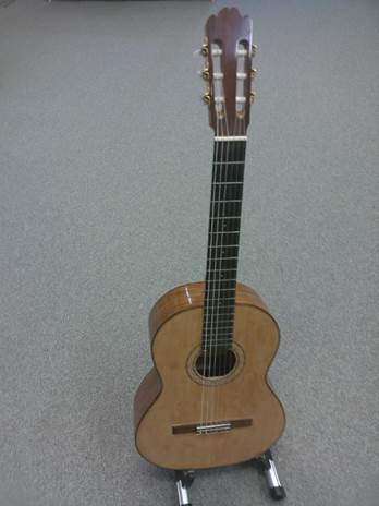 The fingerboard is ebony with inlaid maple. The soundboard is Picea Excelsior ( German Spruce) cut down in Switzerland in 1965