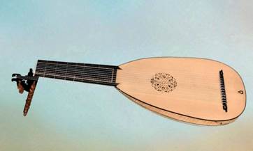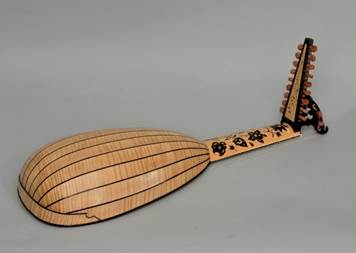 The back of a Baroque lute which is maple with ebony inlaid strips. The flowers are inlaid not painted on