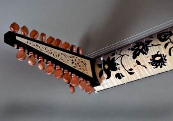 The neck and peg board. The flowers are inlaid not painted. The frets are tied cat gut.